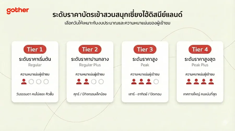 - ตั๋วระดับเริ่มต้น ใช้ในวันราคาสูงกว่าไม่ได้: หากคุณซื้อตั๋วระดับ Tier 1 ไว้ จะไม่สามารถนำไปใช้เข้าสวนสนุกในวันระดับ Tier 3 หรือ Tier 4 ได้ จึงควรตรวจสอบปฏิทินราคาก่อนยืนยันการซื้อทุกครั้ง
